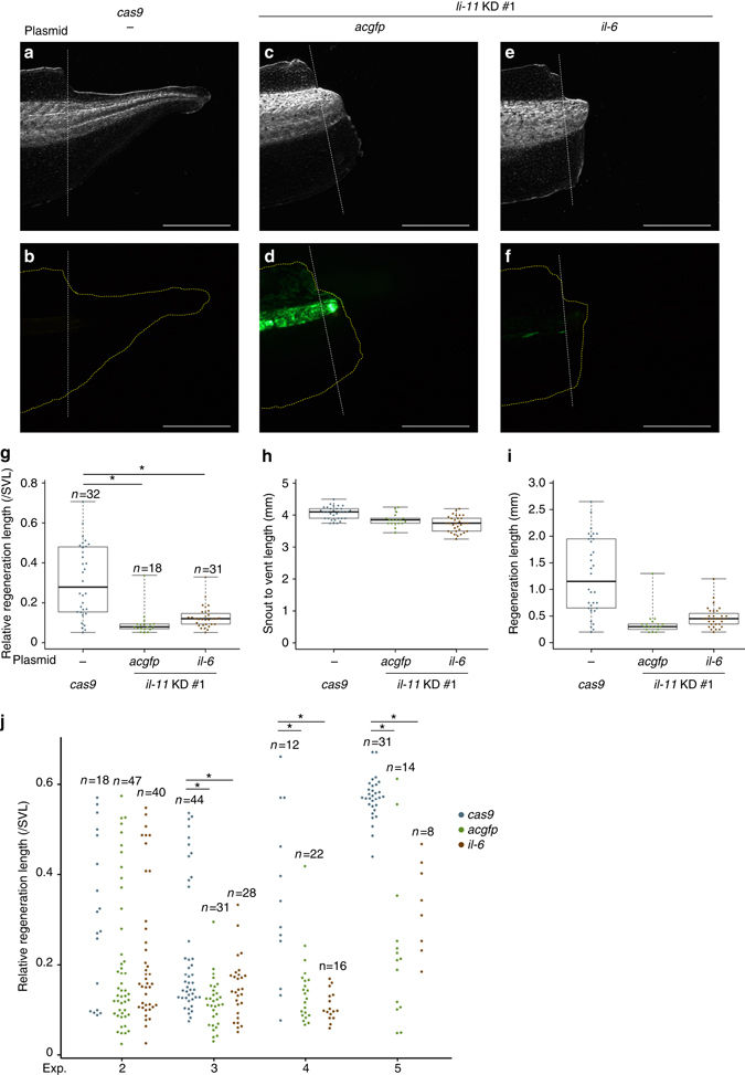 Figure 4. il-6 does not rescue the shortened regeneration length of il-11 KD tadpoles. aâf Representative images of tails of control cas9 mRNA-injected a, b, il-11 knockeddown acgfp-expressing c, d, or il-11 knockeddown il-6âexpressing e, f tadpoles, and their regeneration length g are shown. Dark-field images a, c, e and GFP2-filtered images b, d, f are shown. Regeneration length was normalised by snout to vent length (SVL). h, i, SVL h and regeneration length i used for calculation in g are shown. j Biological replicates using different batches of tadpoles are shown. Box plots are inserted in the panels. Bars in the boxes represent median, upper and lower limits of the boxes represent the first and third quartiles, and whiskers represent maximum and minimum values. Scale bars: 1âmm. Anterior is to the left, dorsal is up. Yellow broken lines indicate outline of the tails. White broken lines indicate amputated plane. *Pâ<â0.05, TukeyâKramerâs test |