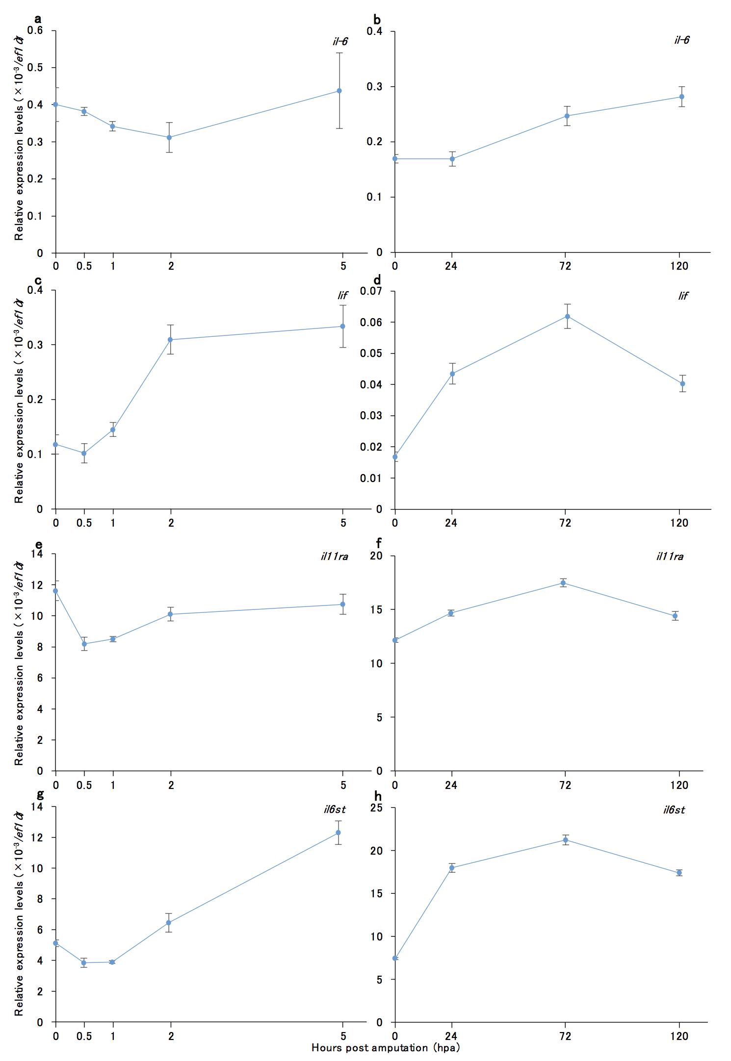Supplementary Figure 2 Expression levels of members of the IL-11 family and receptors for IL-1. Expression levels of il-6 (a, b), lif (c, d), il11ra (e, f), or il6st (g, h) were measured by qRT-PCR using RNA extracted from approximately 20 tadpoles. Tail stump tissues cut at the level of 0.5 mm anterior from the amputated plane were used. Vertical axes represent relative expression levels of the genes normalised by those of ef1α. Mean ± s.e.m. n=4. |