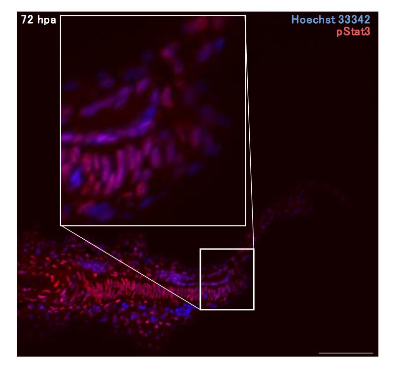 Supplementary Figure 3 Localisation of phosphorylated Stat3 in blastema. Tadpoles fixed at 72 hpa were sagittally sliced, and labelled using antibody against phosphorylated Stat3 (red). Nuclei were counterstained with Hoechst 33342 (blue). Anterior is to the left, dorsal is up. Inset: magnified view of boxed area. Scale bar: 100 μm. |