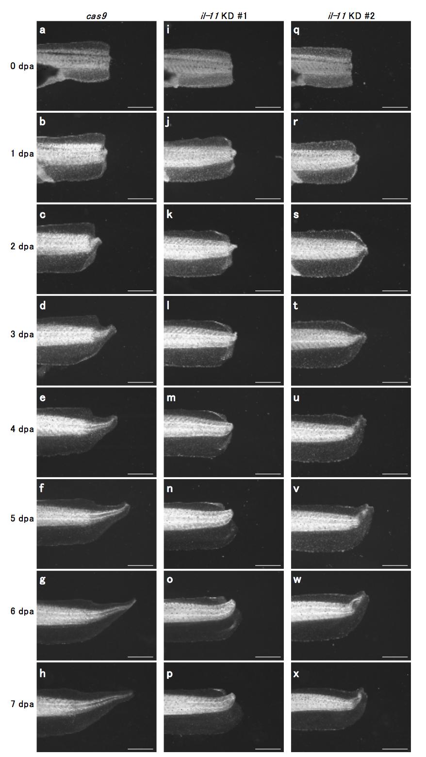 Supplementary Figure 6 The effect of il-11 knock down becomes prominent between 2 and 3 dpa. Time-lapse images of a cas9 mRNA-injected (a-h), il-11 KD #1 (i-p), or #2 (q-x) tadpole are shown. Images were taken at 0 (a, i, q), 1 (b, j, r), 2 (c, k, s), 3 (d, l, t), 4 (e, m, u), 5 (f, n, v), 6 (g, o, w), and 7 (h, p, x) dpa. Anterior is to the left, dorsal is top. Scale bars: 1 mm. |