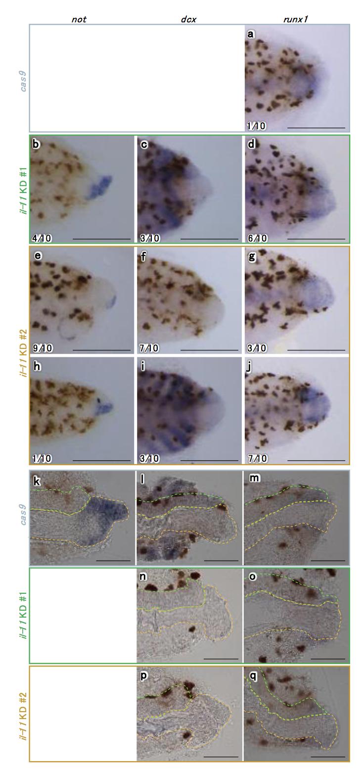 Supplementary Figure 8 Detailed localisation analysis of undifferentiated marker genes in il-11 KD tadpoles. a-d, WISH images for undifferentiated marker genes using cas9 mRNA-injected (a) or il-11 KD #1 (b-d) tadpoles that are not shown in Fig. 5. Representative WISH images for not (b), dcx (c), or runx1 (a and d) are shown. e-j, WISH images for undifferentiated marker genes using il-11 KD #2 tadpoles. Representative WISH images for not (e and h), dcx (f and i), or runx1 (g and j) are shown. k-q, Section images. Representative images for not (k), dcx (l, n and p), or runx1 (m, o and q) using cas9 mRNA-injected (k-m), il-11 KD #1 (n and o), or #2 (p and q) are shown. Anterior is to the left and dorsal is up. Blue/purple colour represents signals for each gene. Brown pigments are melanophores of the tadpoles. Scale bars: 500 μm (a-j) or 100 μm (k-q). Numbers at the bottom corner are the total ratio of tadpoles showing the corresponding expression from two batches. Green broken lines indicate spinal cord and spinal cord ampulla, and yellow broken lines indicate notochord and notochord bud. |
