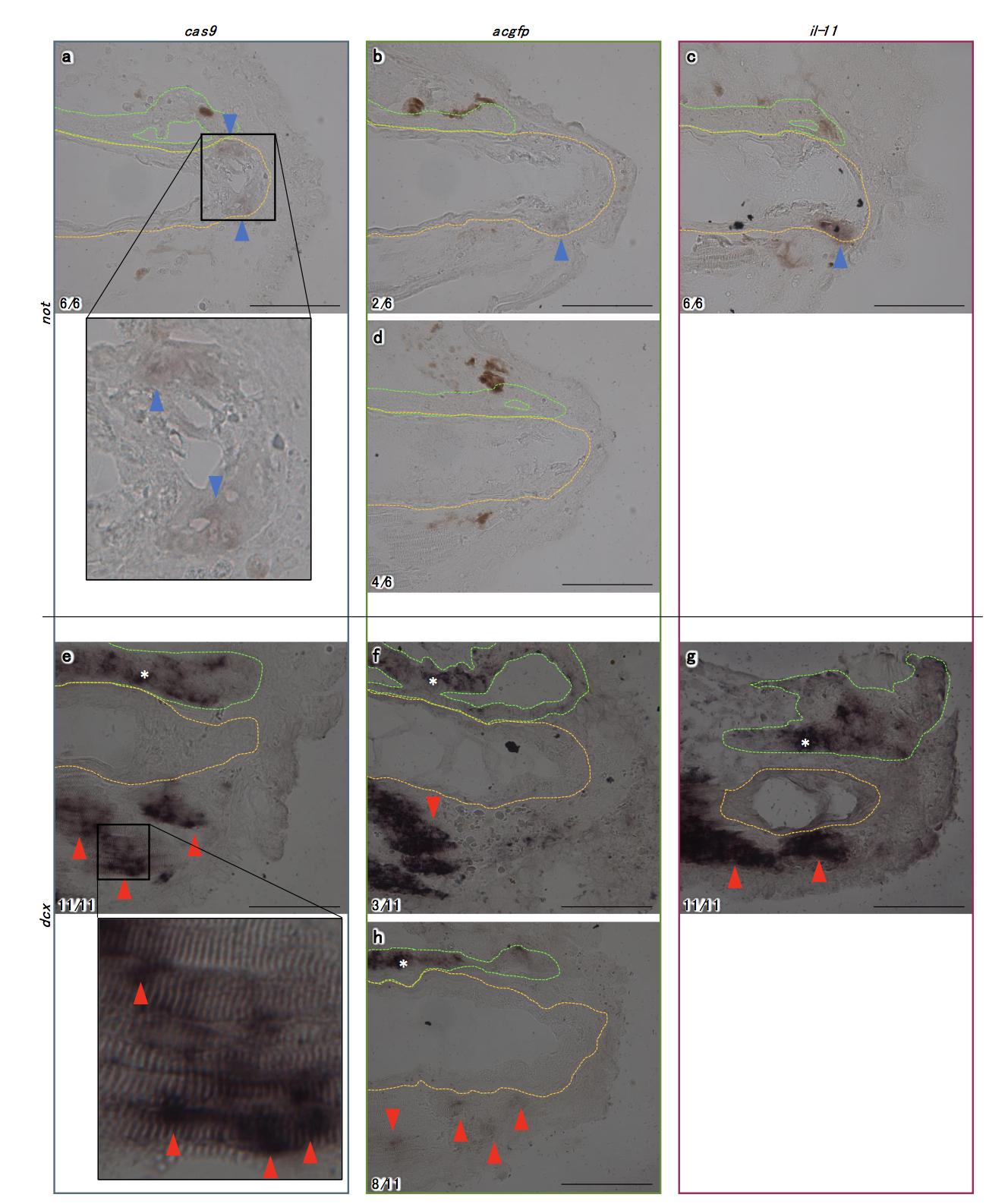 Supplementary Figure 9 Undifferentiated cells are rescued by forced expression of il-11 in il-11 KD tadpoles. ISH images for not (a-d) or dcx (e-h). cas9 mRNA injected (a, e), acgfp (b, d, f, h) or il-11 (c, g)-expressing il-11 KD tadpoles were fixed at 2 dpa, and sagittally sliced. Anterior is to the left, dorsal is up. Scale bars: 100 μm. Magenta/purple colour represents signals for the genes. Brown pigments are melanophores of the tadpoles. Signals for not were detected in the notochord bud (blue arrowheads). Signals for dcx were detected in muscle (red arrowheads) and spinal cord (white asterisks). Numbers at the bottom corner are the total ratio of tadpoles, indicating the corresponding expression from at least two batches. Green broken lines indicate spinal cord and spinal cord ampulla, and yellow broken lines indicate notochord and notochord bud. Inset: magnified view of boxed area. |