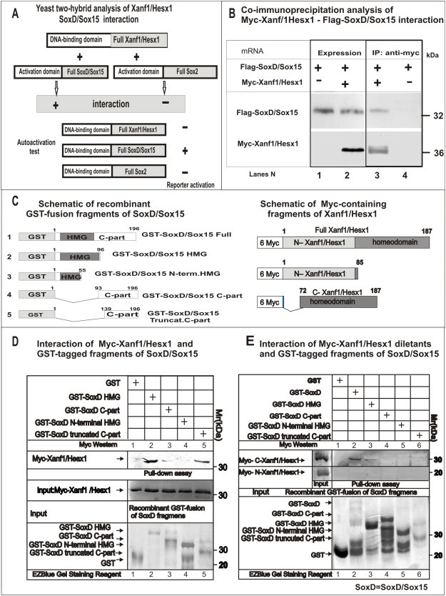 (E) Complex formation between Myc-N-terminal and Myc-C-terminal domains of Xanf1/Hesx1 and Gst-hybrid fragments of SoxD/Sox15.