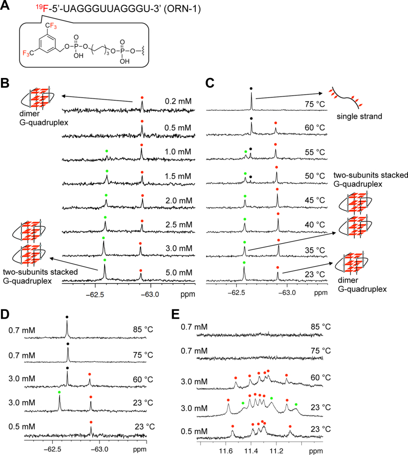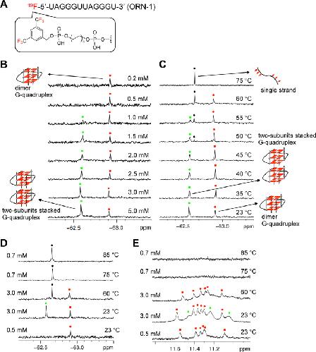 19F NMR and 1H NMR spectra of 19F labeled RNA. (A) Chemical structure of 19F labeled telomere RNA bearing 3,5 bis(trifluoromethyl)phenyl group at the 5Î terminal. (B) 19F NMR spectra of 19F labeled telomere RNA at different concentrations. The peaks of the dimeric and two-subunits stacked G-quadruplex are marked with red and green spots, respectively. Concentrations of RNA indicated on the right. (C)19F NMR of 19F labeled RNA at different temperatures. Red and green spots indicated dimer and two-subunits stacked G-quadruplex. The peaks of single strand are marked with black spots. Temperatures indicated on the right. Condition: 3 mM RNA in 50 mM KCl and 10 mM Tris-HCl buffer (pH 7.0). The sample is kept for 10 min at each temperature. (D) 19F NMR of 19F labeled RNA at different temperatures and concentrations. The peaks of dimer G-quadruplex are red spots. The peak of two-subunits stacked G-quadruplex is green spot. The peaks of single strand are marked with black spots. (E) 1H imino proton NMR of 19F labeled RNA corresponding to 19F NMR at different temperatures and concentrations. The peaks characteristic of the dimeric and two-subunits stacked G-quadruplex are marked with red and green spots, respectively.