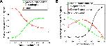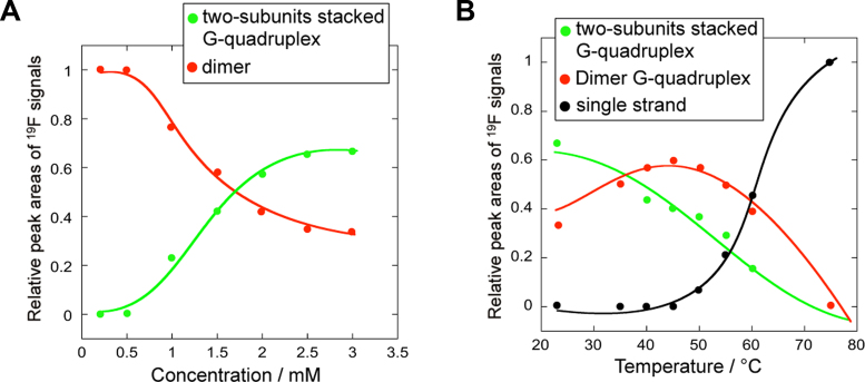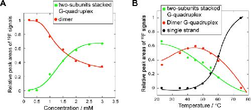 19F NMR shift versus concentration and temperature profiles. (A) Profiles of the relative peak areas of the 19F resonance signals versus concentration. Dimer and two-subunits stacked G-quadruplex conversions followed by 19F NMR spectroscopy. (B) Profiles of the relative peak areas of the 19F resonance signals versus temperature. Two-subunits stacked G-quadruplex/dimer G-quadruplex/single strand conversions followed by 19F NMR spectroscopy. To obtain the relative peak signal of each conformation, the total value of the relative peak signal for three conformations was estimated to be 1.0. Plotting the values of relative peak signal against temperature results in two melting curves for the two-subunits stacked Gquadruplex and dimer G-quadruplex.