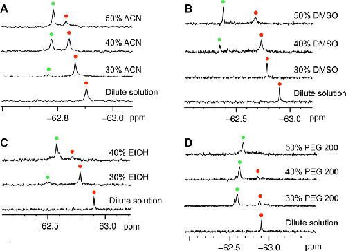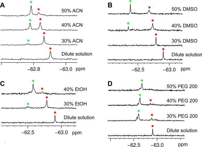 19F NMR of telomere RNA G-quadruplex in molecular crowding conditions. (A–D) 19F NMR spectra of 12-mer telomere RNA (0.5 mM) in crowded solutions induced by (A) ACN, (B) DMSO, (C) EtOH and (D) PEG 200. 19F NMR spectra were recorded under 30% (v/v), 40% (v/v) and 50% (v/v) of ACN, DMSO and PEG 200. The crowding condition of EtOH was only simulated by the addition of 30% (v/v) and 40% (v/v) EtOH, due to 50% (v/v) EtOH leading to a RNA precipitation. Red and green spots indicated the dimeric G-quadruplex and two-subunits stacked G-quadruplex. 19F NMR reference spectrum of 19F labeled 12-mer telomere RNA in dilute solution is shown in each case for comparison.