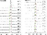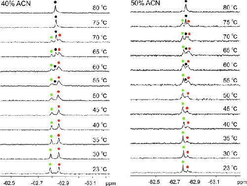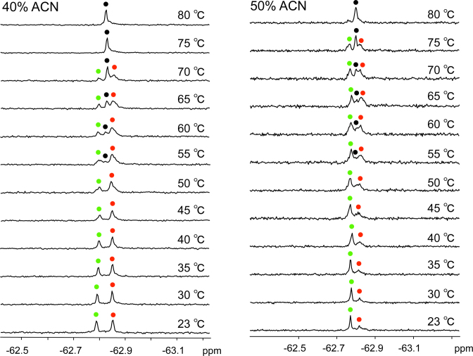 Figure 6. A temperature-dependent experiment of telomere RNA G-quadruplex in molecular crowding conditions. NMR spectra were recorded in crowded solution simulated by 40% (v/v) and 50% (v/v) of ACN. Condition: 0.5 mM RNA in 50 mM KCl and 10 mM Tris-HCl buffer (pH 7.0). The sample is kept for 10 min at each temperature. Red and green spots indicated the dimeric G-quadruplex and two-subunits stacked G-quadruplex. The peaks of single strand are marked with black spots. Temperatures indicated on the right.