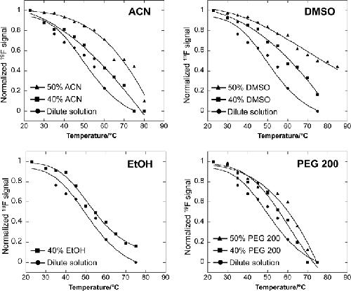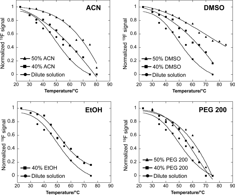 Figure 7. Melting profiles of the relative peak areas of the 19F resonance signals versus temperature. The profiles were obtained by plotting the normalized two-subunits stacked G-quadruplex relative peak areas of the 19F resonance signals in NMR spectra (Figure 2C, Figure 6 and Supplementary Figure S14) as a function of temperature.