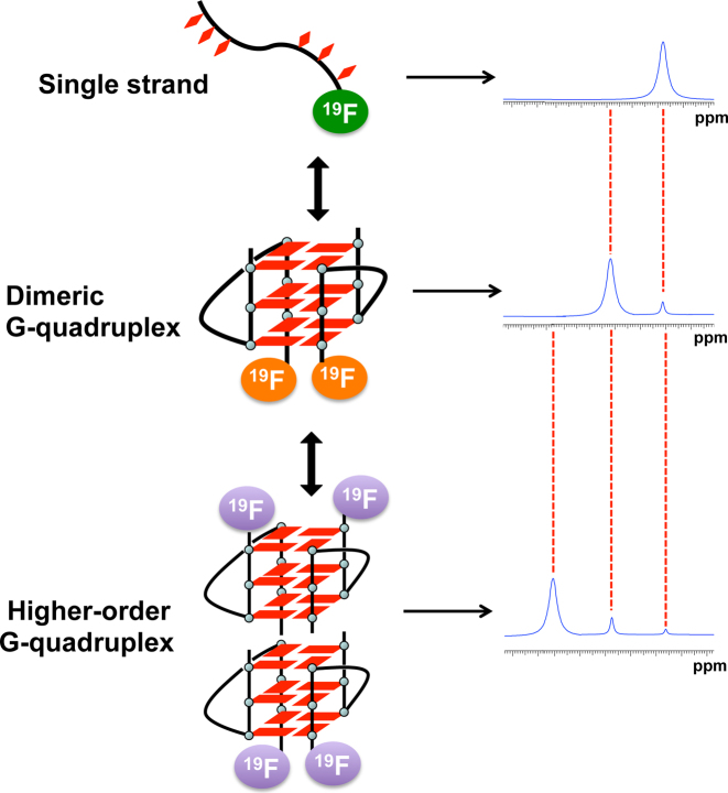Figure 1. Concept for the detection different RNA structures by a 19F label. Three 19F resonances of different chemical shifts are expected according to single-stranded, dimeric G-quadruplex and two-subunits stacked G-quadruplex.