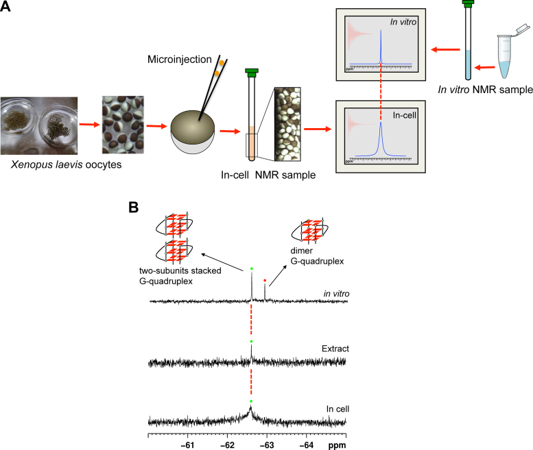 Figure 4. In-cell 19F NMR of telomere RNA G-quadruplex. (A) Schematic overview of in-cell 19F NMR experiments. Xenopus laevis oocytes are sorted and collected for microinjections. For in-cell 19F NMR applications in Xenopus oocytes, telomere RNA sample was injected into the oocyte cells. Comparison with the position of reference in vitro spectrum provides a reliable determination of intracellular telomere RNA conformation. (B) Comparison of 19F NMR spectra of in vitro sample of telomere RNA (up) with Xenopus egg lysates (middle) and in Xenopus oocytes (bottom).