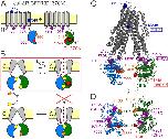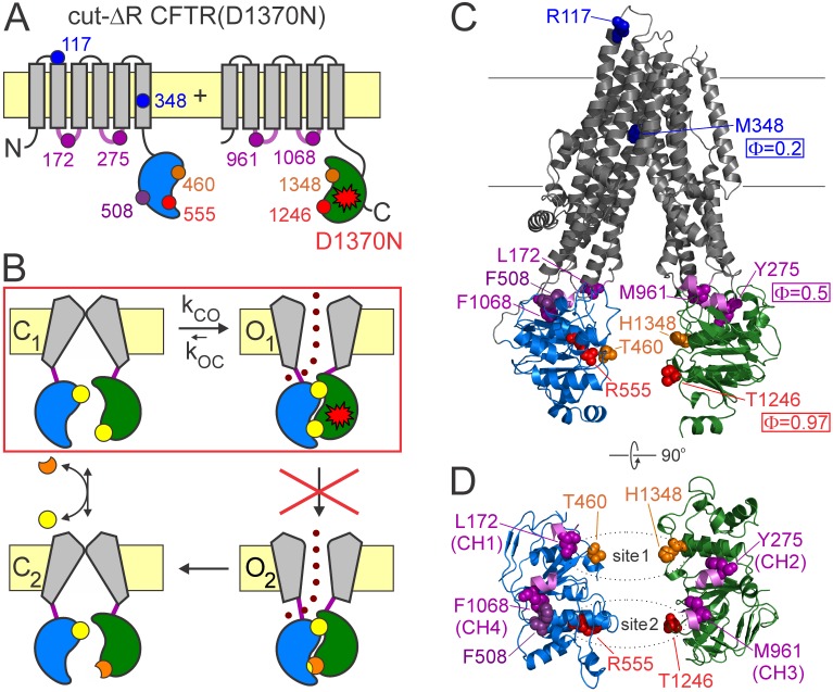 Figure 1. CFTR domain topology, gating mechanism, and localization of target positions.(A) Domain topology of the CFTR cut-ΔR(D1370N) background construct. TMDs, gray; NBD1, blue; NBD2, green; intracellular loops containing coupling helices (CH1-4, from left to right), violet; target positions, colored circles. Red star denotes mutation D1370N. (B) Cartoon gating cycle of WT CFTR; and two-state equilibrium gating (red box) in saturating ATP of the background construct in which the D1370N mutation (red star) disrupts ATP hydrolysis (red cross). ATP, yellow circles; ADP, orange crescents, upper ATP binding site represents non-catalytic site 1, lower site represents catalytic site 2. (C–D) Target positions highlighted in colored spacefill on the cryoEM structure of dephosphorylated closed human CFTR (PDBID: 5UAK). (C) Full-length structure with all target positions shown, color coding as in A. Φ values for positions 1246, 348, and 275 are taken from (Sorum et al., 2015). (D) Only NBDs and coupling helices (CH1-4) shown, viewed from an angle orthogonal to the membrane. Dotted ellipses identify ATP sites 1 and 2. |