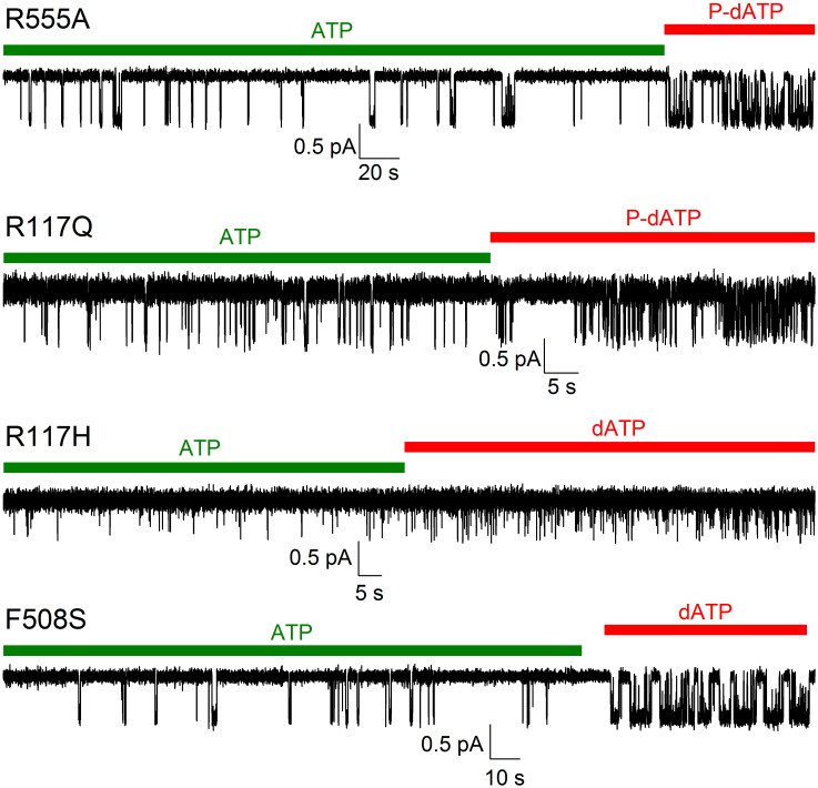 Figure 2—figure supplement 2. Stimulation of open probability by 2'-deoxy-ATP (dATP) or N6-(2-phenylethyl)-dATP (P-dATP) facilitates counting channels for low-Po mutants.Inward currents of single cut-ΔR(D1370N) channels harbouring the indicated mutations. After several minutes of low-Po activity in 10 mM MgATP (green bars), exposure to 5 mM Mg-dATP or 25–50 μM Mg-P-dATP (red bars) robustly stimulated Po. A statistical test based on comparison of the observed opening rate and cumulative open time (Csanády et al., 2000) allowed high-confidence exclusion of the presence of a second active channel for each of the four patches shown (p<10−9, p<10−11, p=0.015, and p<10−14, respectively). |