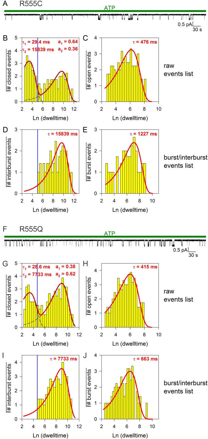 Figure 2—figure supplement 3. Burst analysis of single-channel recordings for position 555 mutants.(A, F) Inward currents of single cut-ΔR(D1370N) channels bearing mutation R555C (A) or R555Q (F) in 10 mM MgATP (green bars). (B–C, G–H), Closed (B, G) and open (C, H) dwell-time histograms (Sigworth and Sine, 1987) constructed from the events list of the records in (A, F); lower binning limit is 12 ms. Solid red lines are maximum likelihood fits of the dwell-times by a double- and a single-exponential distribution, respectively, with time constants (τ(1, 2)) and fractional amplitudes (a1, a2) printed in the panels. Dotted black lines in panels (B, G) depict the two components of the fit; vertical blue line marks the burst delimiter (tcrit) calculated using the method of (Magleby and Pallotta, 1983): this method ensures unbiased estimation of mean burst and interburst durations by equalizing the probabilities of misassigning interburst events as flickery closures and vice versa. (D–E), (I-J) Dwell-time histograms of reconstructed interburst (D, I) and burst (E, J) events following suppression of closed events shorter than tcrit. Solid red lines in D, I replot the longer component of the double-exponential fits in (B, G): note, some flickery closures remain uncancelled (events above red fit line, right of blue line), but an equal number of interburst closures is cancelled (lack of events below red fit line, left of blue line). Solid red lines in (E, J) are maximum likelihood fits of the burst durations by single-exponential distributions (τ, time constant). |