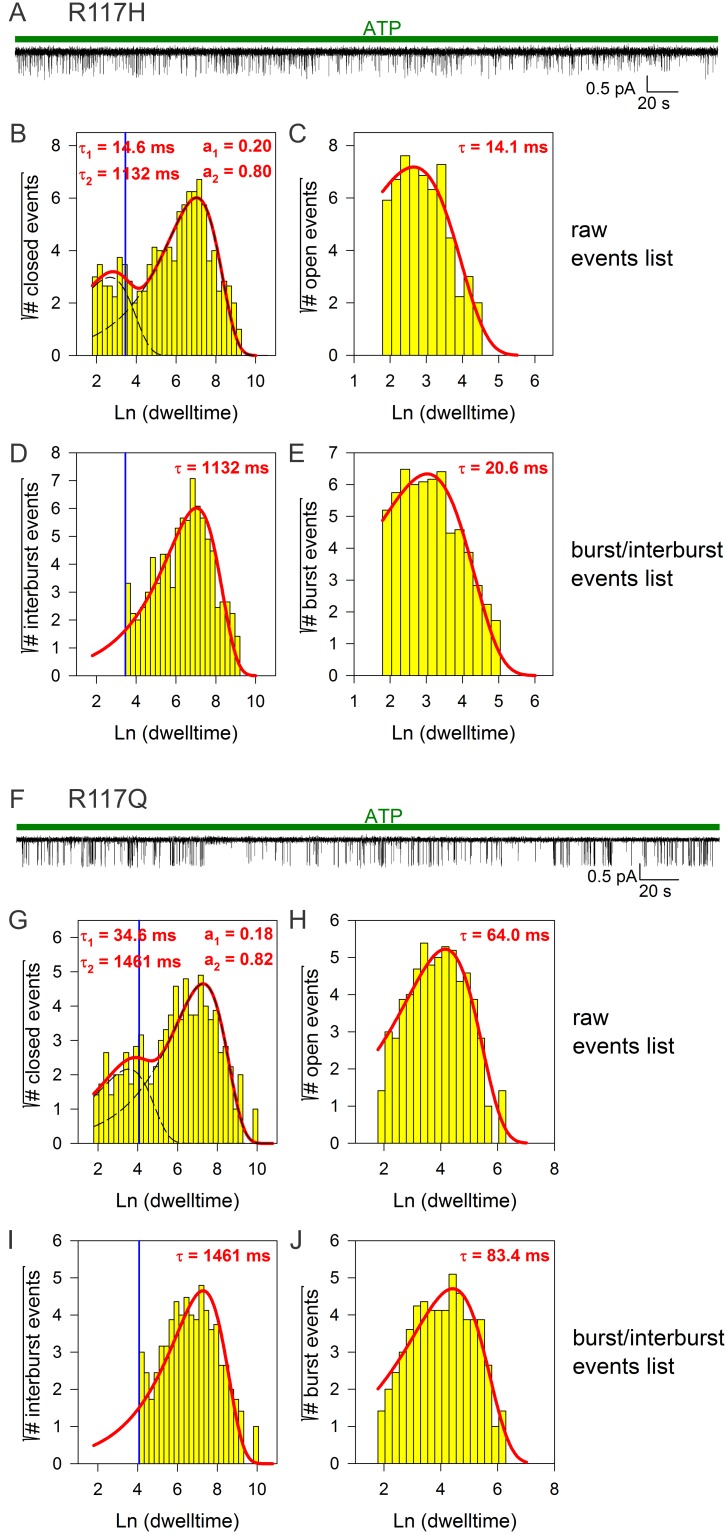 Figure 2—figure supplement 4. Burst analysis of single-channel recordings for position 117 mutants.(A, F) Inward currents of single cut-ΔR(D1370N) channels bearing mutation R117H (A) or R117Q (F) in 10 mM MgATP (green bars). (B–C, G–H) Closed (B, G) and open (C, H) dwell-time histograms (Sigworth and Sine, 1987) constructed from the events list of the records in (A, F); lower binning limit is 6 ms. Solid red lines are maximum likelihood fits of the dwell-times by a double- and a single-exponential distribution, respectively, with time constants (τ(1, 2)) and fractional amplitudes (a1, a2) printed in the panels. Dotted black lines in panels (B, G) depict the two components of the fit; vertical blue line marks the burst delimiter (tcrit) calculated using the method of (Magleby and Pallotta, 1983). (D–E, I–J) Dwell-time histograms of reconstructed interburst (D, I) and burst (E, J) events following suppression of closed events shorter than tcrit. Solid red lines in (D, I) replot the longer component of the double-exponential fits in (B, G). Solid red lines in (E, J) are maximum likelihood fits of the burst durations by single-exponential distributions (τ, time constant). |