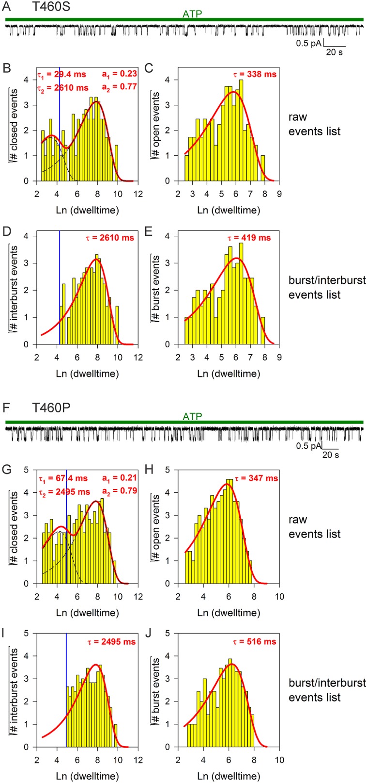 Figure 3—figure supplement 2. Burst analysis of single-channel recordings for position 460 mutants.(A, F) Inward currents of single cut-ΔR(D1370N) channels bearing mutation T460S (A) or T460P (F) in 10 mM MgATP (green bars). (B–C, G–H) Closed (B, G) and open (C, H) dwell-time histograms (Sigworth and Sine, 1987) constructed from the events list of the records in (A, F); lower binning limit is 12 ms. Solid red lines are maximum likelihood fits of the dwell-times by a double- and a single-exponential distribution, respectively, with time constants (τ(1, 2)) and fractional amplitudes (a1, a2) printed in the panels. Dotted black lines in panels (B, G) depict the two components of the fit; vertical blue line marks the burst delimiter (tcrit) calculated using the method of (Magleby and Pallotta, 1983). (D–E, I–J) Dwell-time histograms of reconstructed interburst (D, I) and burst (E, J) events following suppression of closed events shorter than tcrit. Solid red lines in (D, I) replot the longer component of the double-exponential fits in (B, G). Solid red lines in (E, J) are maximum likelihood fits of the burst durations by single-exponential distributions (τ, time constant). |