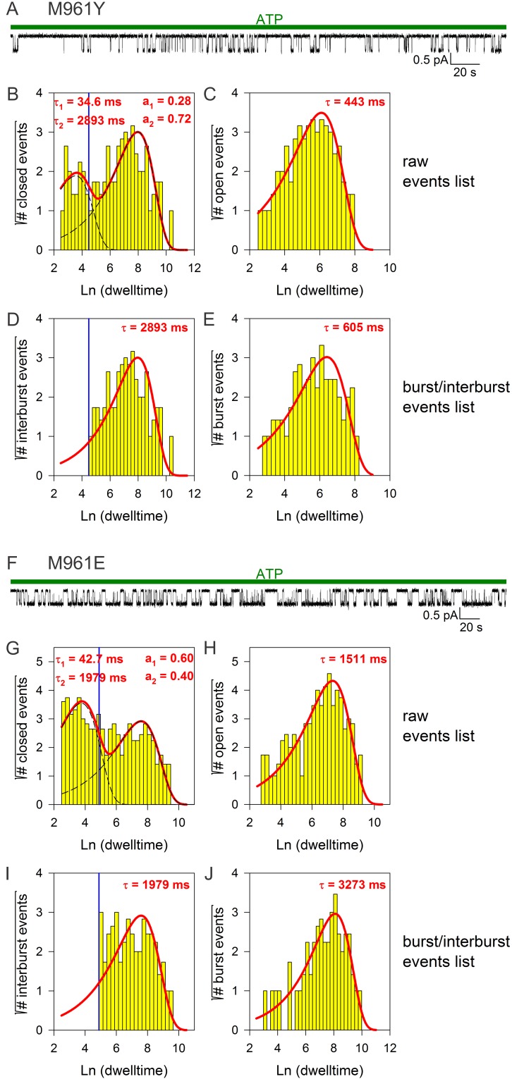 Figure 4—figure supplement 2. Burst analysis of single-channel recordings for position 961 mutants.(A, F) Inward currents of single cut-ΔR(D1370N) channels bearing mutation M961Y (A) or M961E (F) in 10 mM MgATP (green bars). (B–C, G–H) Closed (B, G) and open (C, H) dwell-time histograms (Sigworth and Sine, 1987) constructed from the events list of the records in (A, F); lower binning limit is 12 ms. Solid red lines are maximum likelihood fits of the dwell-times by a double- and a single-exponential distribution, respectively, with time constants (τ(1, 2)) and fractional amplitudes (a1, a2) printed in the panels. Dotted black lines in panels (B, G) depict the two components of the fit; vertical blue line marks the burst delimiter (tcrit) calculated using the method of (Magleby and Pallotta, 1983). (D–E, I–J), Dwell-time histograms of reconstructed interburst (D, I) and burst (E, J) events following suppression of closed events shorter than tcrit. Solid red lines in (D, I) replot the longer component of the double-exponential fits in (B, G). Solid red lines in (E, J) are maximum likelihood fits of the burst durations by single-exponential distributions (τ, time constant). |