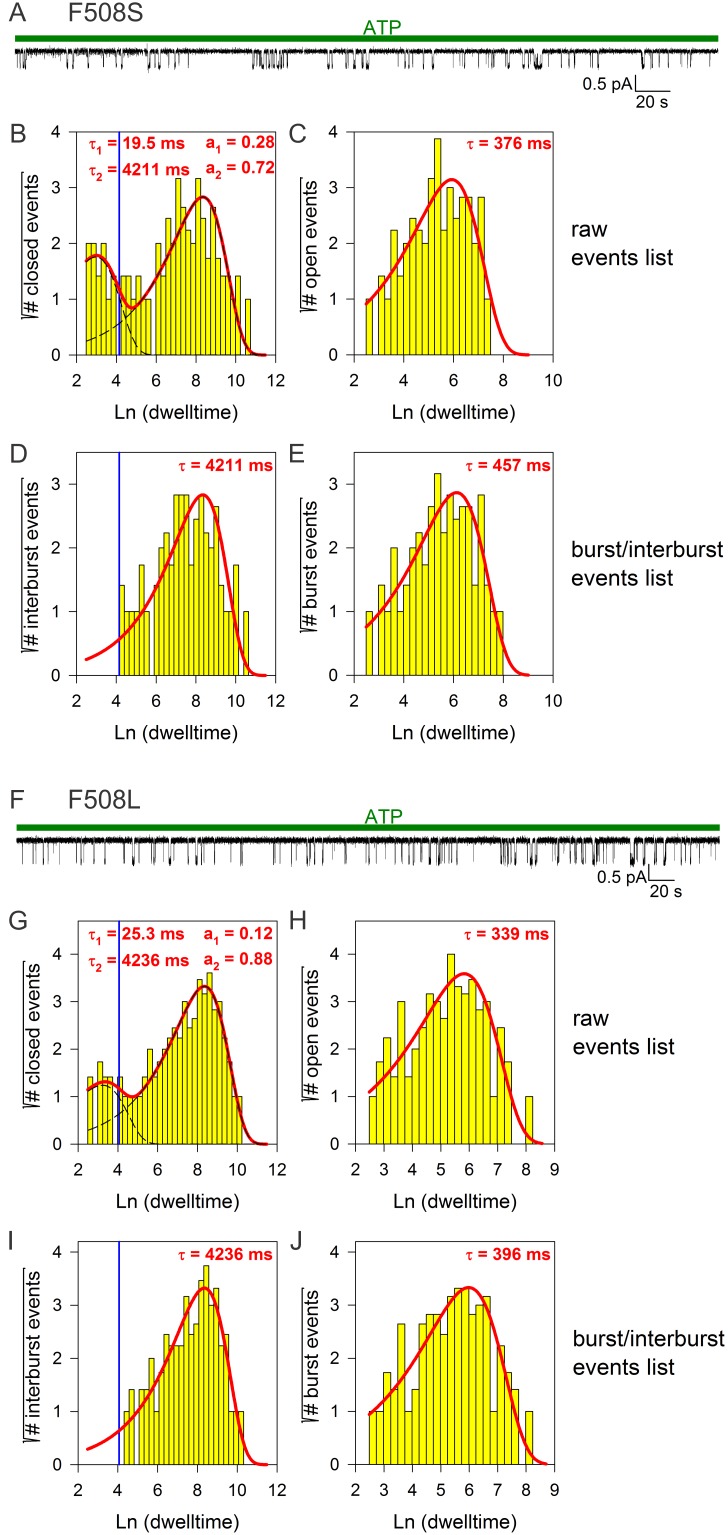 Figure 5—figure supplement 1. Burst analysis of single-channel recordings for position 508 mutants.(A, F) Inward currents of single cut-ΔR(D1370N) channels bearing mutation F508S (A) or F508L (F) in 10 mM MgATP (green bars). (B–C, G–H) Closed (B, G) and open (C, H) dwell-time histograms (Sigworth and Sine, 1987) constructed from the events list of the records in (A, F); lower binning limit is 12 ms. Solid red lines are maximum likelihood fits of the dwell-times by a double- and a single-exponential distribution, respectively, with time constants (τ(1, 2)) and fractional amplitudes (a1, a2) printed in the panels. Dotted black lines in panels (B, G) depict the two components of the fit; vertical blue line marks the burst delimiter (tcrit) calculated using the method of (Magleby and Pallotta, 1983). (D–E, I–J) Dwell-time histograms of reconstructed interburst (D, I) and burst (E, J) events following suppression of closed events shorter than tcrit. Solid red lines in (D, I) replot the longer component of the double-exponential fits in (B, G). Solid red lines in (E, J) are maximum likelihood fits of the burst durations by single-exponential distributions (τ, time constant). |