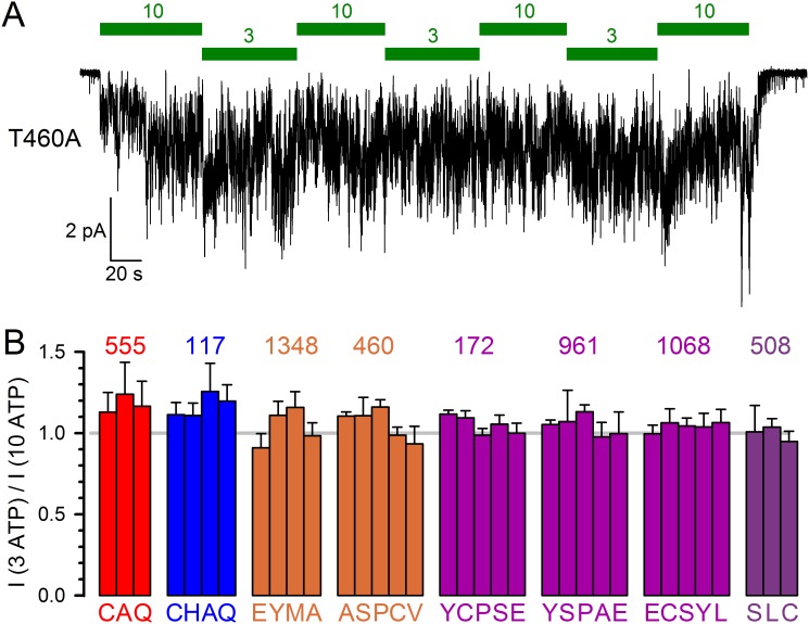 Figure 2—figure supplement 1. All tested constructs are saturated by 10 mM ATP.(A) Representative macroscopic inward current of CFTR channels bearing mutation T460A in the cut-ΔR(D1370N) background, recorded in an inside-out patch at −80 mV in response to alternating exposures to 3 and 10 mM MgATP (green bars). (B) Fractional macroscopic currents in 3 mM ATP, normalized to the mean of the currents in the presence of bracketing applications of 10 mM ATP, for cut-ΔR(D1370N) channels harbouring the indicated amino-acid substitutions (letters) at the respective target positions (numbers above groups of bars). Bars are grouped by target position, color coding as in Figures 1 and 6. All data are shown as mean ± SEM (n = 3–11). For the background construct I3 ATP / I10 ATP=1.00 ± 0.07 (n = 6) (cf., Sorum et al., 2015). |