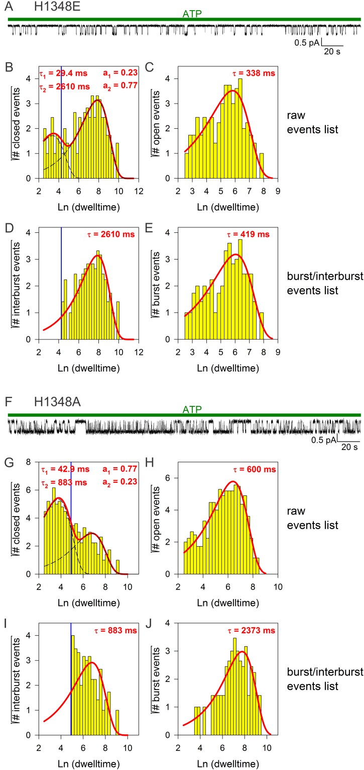 Figure 3—figure supplement 1. Burst analysis of single-channel recordings for position 1348 mutants.(A, F) Inward currents of single cut-ΔR(D1370N) channels bearing mutation H1348E (A) or H1348A (F) in 10 mM MgATP (green bars). (B–C, G–H) Closed (B, G) and open (C, H) dwell-time histograms (Sigworth and Sine, 1987) constructed from the events list of the records in (A, F); lower binning limit is 12 ms. Solid red lines are maximum likelihood fits of the dwell-times by a double- and a single-exponential distribution, respectively, with time constants (τ(1, 2)) and fractional amplitudes (a1, a2) printed in the panels. Dotted black lines in panels (B, G) depict the two components of the fit; vertical blue line marks the burst delimiter (tcrit) calculated using the method of (Magleby and Pallotta, 1983). (D–E, I–J), Dwell-time histograms of reconstructed interburst (D, I) and burst (E, J) events following suppression of closed events shorter than tcrit. Solid red lines in (D, I) replot the longer component of the double-exponential fits in (B, G). Solid red lines in (E, J) are maximum likelihood fits of the burst durations by single-exponential distributions (τ, time constant). |