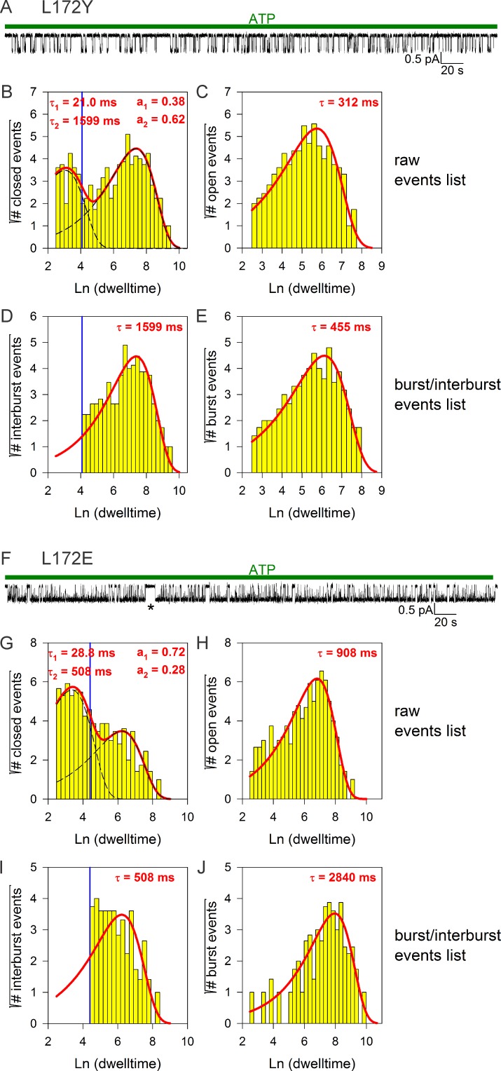 Figure 4—figure supplement 1. Burst analysis of single-channel recordings for position 172 mutants.(A, F) Inward currents of single cut-ΔR(D1370N) channels bearing mutation L172Y (A) or L172E (F) in 10 mM MgATP (green bars). (B–C, G–H), Closed (B, G) and open (C, H) dwell-time histograms (Sigworth and Sine, 1987) constructed from the events list of the records in (A, F); lower binning limit is 12 ms. Solid red lines are maximum likelihood fits of the dwell-times by a double- and a single-exponential distribution, respectively, with time constants (τ(1, 2)) and fractional amplitudes (a1, a2) printed in the panels. Dotted black lines in panels (B, G) depict the two components of the fit; vertical blue line marks the burst delimiter (tcrit) calculated using the method of (Magleby and Pallotta, 1983). (D–E, I–J) Dwell-time histograms of reconstructed interburst (D, I) and burst (E, J) events following suppression of closed events shorter than tcrit. Solid red lines in (D, I) replot the longer component of the double-exponential fits in (B, G). Solid red lines in (E, J) are maximum likelihood fits of the burst durations by single-exponential distributions (τ, time constant). A single long interburst event in F marked by an asterisk was omitted from the analysis. |