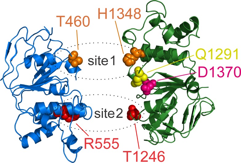 Figure 6—figure supplement 1. Location of aspartate 1370, mutated in our background construct.Structures of NBD1 (blue) and NBD2 (green) of human dephosphorylated CFTR in a closed ATP-free state (PDBID: 5UAK) viewed top-down from the direction of the membrane. ATP sites 1 and 2 are highlighted by dotted ellipses, target positions in both sites are shown in spacefill. Aspartate 1370 (salmon spacefill) is located between the two ATP sites, at the boundary between the core and α-helical subdomains of NBD2, and interacts with Q-loop glutamine 1291 (yellow spacefill). |
