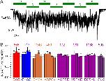 Figure 2. Longitudinal Φ value gradient extends from catalytic site 2 to the extracellular surface.(A, F) Inward unitary currents of the cut-ΔR(D1370N) CFTR background construct, and of channels bearing mutations at either position 555 (A) or position 117 (F), in the same background. Letters to the left of the traces indicate the amino acid present in the target position; the native residue is marked by red. Currents were recorded in symmetrical 140 mM Cl-, at −80 mV in (A) but at −100 mV in (F); dashes on the left mark zero-current level. (B–D) and (G–I), Mean burst (B, G, τb) and interburst (C, H, τib) durations and open probabilities (D, I, Po) of the constructs in A and F, respectively. Red horizontal lines highlight the respective control values of the background construct which is identified by the red letter representing the native target residue. All data are shown as mean ± SEM (n = 6 for data in B–D, n = 5–7 for data in G–I). (E, J) Brønsted plots for position 555 (E) and 117 (J). Red symbol and letter identifies the background construct. Solid lines are linear regression fits with slope Φ indicated.Figure 2—figure supplement 1. All tested constructs are saturated by 10 mM ATP.(A) Representative macroscopic inward current of CFTR channels bearing mutation T460A in the cut-ΔR(D1370N) background, recorded in an inside-out patch at −80 mV in response to alternating exposures to 3 and 10 mM MgATP (green bars). (B) Fractional macroscopic currents in 3 mM ATP, normalized to the mean of the currents in the presence of bracketing applications of 10 mM ATP, for cut-ΔR(D1370N) channels harbouring the indicated amino-acid substitutions (letters) at the respective target positions (numbers above groups of bars). Bars are grouped by target position, color coding as in Figures 1 and 6. All data are shown as mean ± SEM (n = 3–11). For the background construct I3 ATP / I10 ATP=1.00 ± 0.07 (n = 6) (cf., Sorum et al., 2015). |