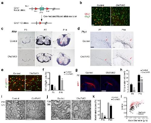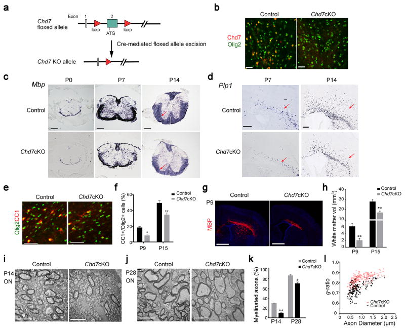 Figure 2. Chd7 is required for proper CNS myelination(a) Diagram depicting Cre mediated excision of the floxed Chd7 exon 2.(b) Immunolabeling of Chd7 and Olig2 in the corpus callosum of P14 brain from control and Chd7cKO mice. Scale bar, 40 μm.(c) mRNA expression of Mbp in the spinal cord of control and Chd7cKO mice at P0, P7 and P14. Scale bars, 100 μm. Arrows point to the spinal white matter region.(d) mRNA expression of Plp in P7 and P14 brain sections from control and Chd7cKO mice. Scale bar, 100 μm. Arrows point to the white matter.(e) Immunostaining for CC1 and Olig2 in the corpus callosum from control and Chd7cKO mice at P7. Scale bar, 100 μm.(f) Quantification of CC1+ OLs as a percentage of total Olig2+ cells in the corpus callosum of Control and Chd7cKO at indicated ages (The data are presented as mean ± s.e.m. For P9, n = 3 controls and 2 mutants, * p = 0.026, t = 4.12; for P15, n = 4 controls and 4 mutants, ** p = 0.009, t = 3.79; n, numbers of animals; Two-tailed unpaired Student’s t test).(g) Immunolabeling of MBP on coronal brain sections from control and Chd7cKO mice at P9. Nuclei are counterstained with 4,6-diamidino-2-phenylindole (DAPI; blue). Scale bar, 1 mm.(h) Quantification of total cerebral white matter volume (MBP+) of control and Chd7cKO mice at P9 and P15 (The data are presented as mean ± s.e.m. For P9, n = 3 controls and 3 mutants, ** p = 0.002, t = 7.22; for P15, n = 4 controls and 4 mutants, ** p = 0.009, t = 3.74; n, numbers of animals; Two-tailed unpaired Student’s t test).(i,j) Electron micrographs of transverse optic nerve sections from P14 (i) and P28 (j) control and Chd7cKO mice. Scale bars, 4 μm.(k) Quantification of myelinated axons as a percentage of total axons (The data are presented as mean ± s.e.m. For P14, n = 3 controls and 3 mutants, ** p = 0.0017, t = 10.73; for P28, n = 4 controls and 4 mutants, * p = 0.0217, t = 3.656; n, numbers of animals; Two-tailed unpaired Student’s t test).(l) Quantification of myelin sheath thickness (g-ratio) in control and Chd7cKO optic nerves (p < 0.0001; for control, g-ratio = 0.7227 ± 0.007414, n = 196 axons from 3 control optic nerves; for Chd7cKO, g-ratio = 0.8325 ± 0.003235, n = 202 axons from 3 Chd7cKO optic nerves; Two-tailed unpaired Student’s t test). |
