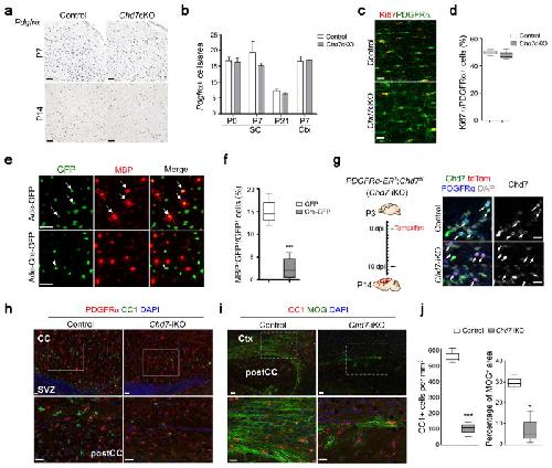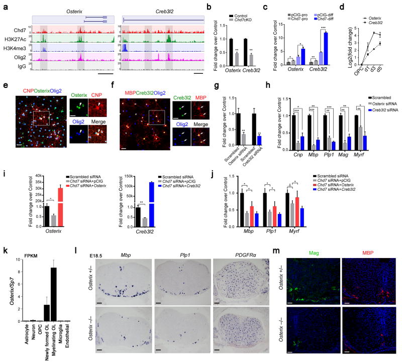 Chd7 siRNA = 2.62).k) Graph depicts RNA abundance represented as FPKM in indicated neural cell types.l) RNA in situ hybridization for Mbp, Plp1 and PDGFRα on transverse spinal cord sections from Osterix