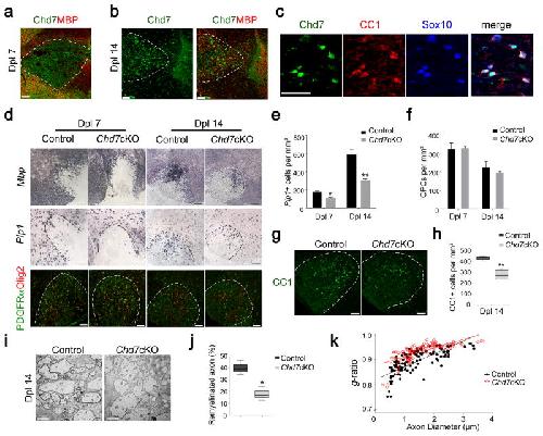 Figure 4. Chd7 is required for timely CNS remyelination(a,b) Immunostaining showing Chd7 and MBP at Dpl 7 and 14 in spinal cord LPC lesions from 8-week old mice. Scale bar, 50 μm.(c) Immunostaining showing Chd7, CC1, and Sox10 at Dpl 14 in spinal cord LPC lesions. Scale bar, 50 μm.(d) In situ hybridization for Mbp and Plp and immunolabeling for PDGFRα and Olig2 in spinal LPC lesions of control and Chd7cKO mutants at Dpl 7 and 14. Scale bars, 100 μm.(e,f) Quantification of Plp1+ OLs and PDGFRα+ OPCs in LPC lesion sites at Dpl 7 and 14 (The data are presented as mean ± s.e.m. For Plp1 at Dpl 7, n = 4 controls and 4 mutant animals, * p = 0.022, t = 3.079; for Plp1 at Dpl 14, n = 4 controls and 4 mutant animals, ** p = 0.0098, t = 3.726; for PDGFRα+ OPCs at Dpl 7, n = 4 controls and 3 mutant animals, p = 0.848, t = 0.202; for PDGFRα+ OPCs at Dpl 14, n = 3 controls and 4 mutant animals, p = 0.299, t = 1.158; Two-tailed unpaired Student’s t test).(g) Immunostaining for CC1 in LPC lesions from control and Chd7cKO spinal cords at Dpl 14. Scale bar, 100 μm.(h) Quantification of CC1+ OLs in LPC lesion sites at Dpl 14 (n = 4 controls and 4 mutant animals, ** p = 0.0015, t = 5.523; whiskers show minimum and maximum, box limits are first and third quartile and center lines are median; Two-tailed unpaired Student’s t test)(i) EM images of LPC lesions from control and Chd7cKO spinal cords at Dpl 14. Scale bar, 2 μm.(j) The percentage of remyelinated axons in LPC-induced lesions of control and Chd7cKO spinal cords at Dpl 14 (n = 4 controls and 4 mutant animals, * p = 0.0188, t = 3.191; whiskers show minimum and maximum, box limits are first and third quartile and center lines are median; Two-tailed unpaired Student’s t test).(k) The myelin g-ratio in LPC-induced lesions of control and Chd7cKO mutants at Dpl 14 (for control, g-ratio = 0.8943 ± 0.005128, n = 128 remyelinated axons from 4 control mice; for Chd7cKO, g-ratio = 0.9330 ± 0.003088, n = 126 remyelinated axons from 4 mutant mice; p < 0.0001, t = 6.440; Two-tailed unpaired Student’s t test). |