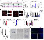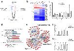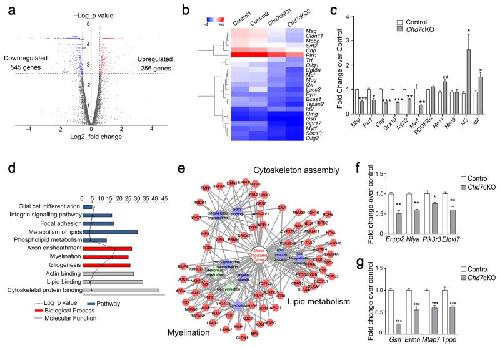 Figure 5. Chd7 controls the core myelinogenic regulatory network(a) Volcano plots depict gene expression changes between control and Chd7cKO spinal cord at P8. Significantly differential transcripts were highlighted in color and totaled in each direction (FDR < 0.05).(b) Heat map representing the expression of OL differentiation-related genes in control and Chd7cKO spinal cords from two independent animals.(c) qRT-PCR analysis of myelination-associated genes in P8 control and Chd7cKO spinal cords (The data are presented as mean ± s.e.m. n = 3 controls and 3 mutant tissues; for Mbp, *** p = 0.0008, t = 9.11; for Plp1 * p = 0.028, t = 3.37; for Cnp, *** p = 0.0001, t = 14.63; for Sox10, *** p = 0.0005, t = 10.05; for Tcf7l2, ** p = 0.0049, t = 5.62; for Myrf, * p = 0.03, t = 3.29; for Pdgfrα, p = 0.168, t = 1.68; for Hes1, * p = 0.027, t = 3.38; for Hes5, p = 0.98, t = 0.02; for Id2, * p = 0.049, t = 2.81; for Id4, * p = 0.03, t = 3.29; Two-tailed unpaired Student’s t test).(d) The gene ontology (GO) analysis of the significantly down-regulated genes between control and Chd7cKO.(e) Protein-protein interaction networks among down-regulated genes in Chd7cKO are plotted using a ToppGene suite.(f,g) qRT-PCR validation of selected genes involved in lipid metabolism (f) and cytoskeleton organization in control vs. Chd7cKO spinal cords at P8 (g) (The data are presented as mean ± s.e.m. n = 3 controls and 3 mutant tissues; for Enpp2, ** p = 0.002, t = 6.67; for Nfya, ** p = 0.0018, t = 7.41, for Pik3r3, * p = 0.046, t = 2.86; for Elovl7, ** p = 0.0012, t = 8.22; for Gsn, *** p < 0.001, t = 14.809; for Ermn, *** p < 0.001, t = 8.659; for Mtap7, *** p < 0.001, t = 10.181; for Tppp, *** p < 0.001, t = 9.907; Two-tailed unpaired Student’s t test). |