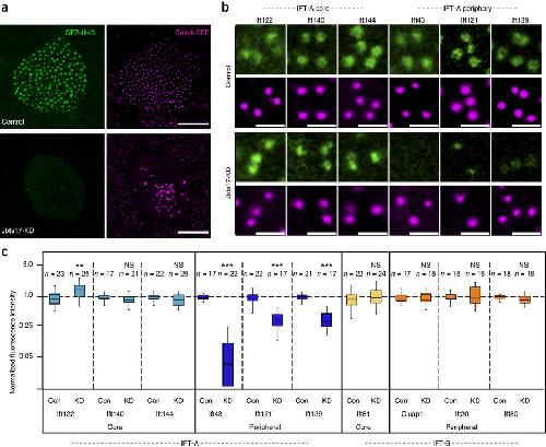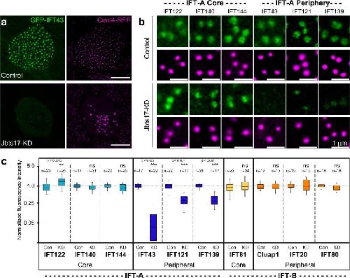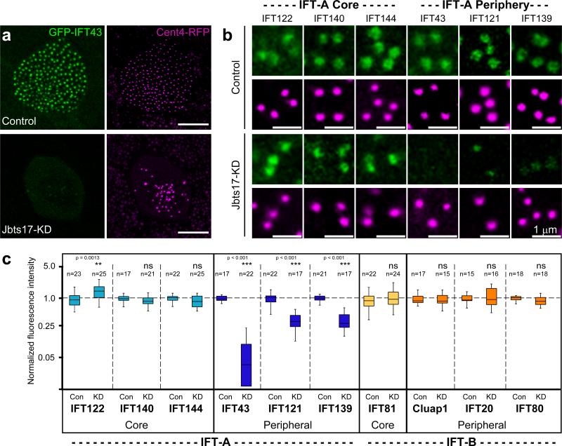 Figure 3: Jbts17 is necessary for recruitment of peripheral IFT-A proteins to basal bodies.(a) Ift43 localization at basal bodies in Xenopus MCCs, as marked by Cetn4-RFP, is lost in MCCs after Jbts17 knockdown. Scale bars, 10 μm. (b) Peripheral IFT-A components are not recruited to Cetn4-RFP-labeled basal bodies after Jbts17 knockdown. IFT-A components are fused to GFP. Scale bars, 1 μm. (c) Quantification of IFT protein localization to basal bodies from two independent experiments. Box plots show fluorescence intensities of GFP fusions to indicated IFT proteins normalized against the intensity of Cetn4-RFP (Online Methods). Peripheral IFT-A proteins are specifically lost after Jbts17 knockdown. **P = 0.0013, ***P < 0.001; NS, not significant. |