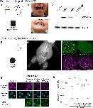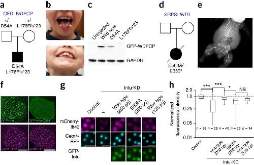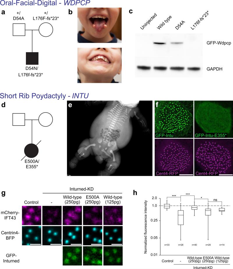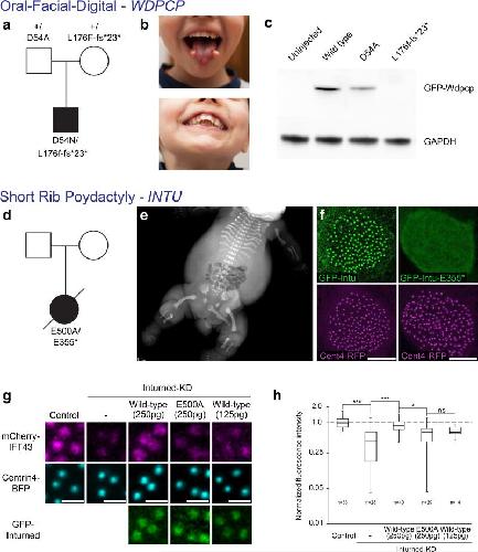 Figure 6. CPLANE mutations in human ciliopathies(a) Pedigree showing WDPCP mutations in an OFD patient. (b) The patient displays tongue hamartomas and dental anomalies. (c) When expressed in Xenopus embryos, the D54A allele of human WDPCP produces less protein compared to wild-type; the L176F-fs26* allele produces no protein. (d) Pedigree showing INTU mutations in an SRPS phenotype. (e) X-ray of the patient. (f) The E355* allele of INTU disrupts basal body localization. (g and h) Wild-type Intu rescues Ift43 localization to basal bodies after Intu knockdown; the E500A allele of Intu does not. Data shown are pooled from three independent experiments. |