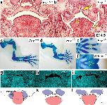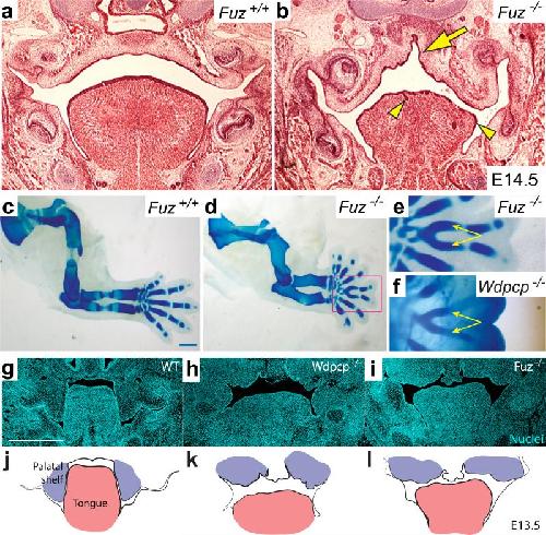 Figure 5. CPLANE mutant mice display diagnostic features of Oral-Facial-Digital Syndrome Type 6(a and b) Frontal sections at E14.5 reveal that Fuz mutant mice display high arched palate (arrow) and lobulation of the tongue (arrowheads). (c and d) Fuz mutant mice display develop polydactyly with Y-shaped metacarpals. (e) Wdpcp mutant mice display develop polydactyly with Y-shaped metacarpals. (f, g, h) Frontal sections of E13.5 Wildtype, Wdpcp and Fuz mutant embryos. DAPI labels nuclei (cyan). (fâ, gâ, hâ) Illustrations highlighting the corresponding palatal condensations (purple) and tongue (pink) in F-H. Mutant palatal condensations form more medially than do controls and fail to extend into the mouth (See Tabler et al., 2013). |