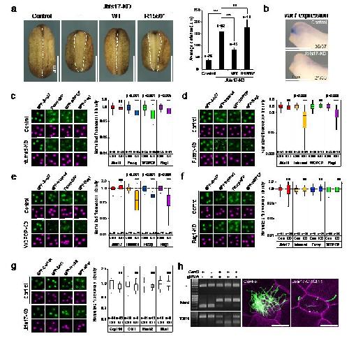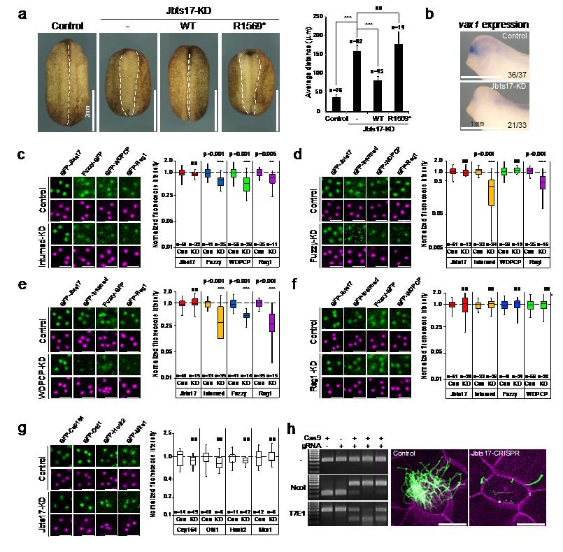 Supplementary Figure 3 Basal body localization of CPLANE proteins. (a) Dorsal views of stage 19 Xenopus embryos show neural tube closure defects after Jbts17-knockdown that are rescued by expression of Jbst17-wild-type but not the Joubert-associated truncation (R1569*). The graph shows average distance between neural folds. (b) In situ hybridization to stage 30 Xenopus embryos shows loss of vax1, a gene downstream of sonic hedgehog, after Jbts17 knockdown; numbers in each panel indicate the number of embryos showing the phenotype. (c-f) Fluorescence micrographs show the localization of CPLANE proteins at basal bodies in Inturned (c), Fuzzy (d), Wdpcp (e) or Rsg1 (f) knockdown multi-ciliated cells. Green and red signals indicate GFP-tagged CPLANE proteins and centrin4-RFP, respectively. The graphs to the right in each figure show fluorescence intensity of GFP signals normalized against Centrin4-RFP (ns, non-significant; **P < 0.01; *** P < 0.001). (g) Fluorescence micrographs show the localization GFP-tagged Cep164, Ofd1, Hook2 and Mks1 in multi-ciliated cells in controls and after Jbts17 knockdown. The graph at right shows the normalized fluorescence intensity for the indicated proteins, as described for c-f. (h) CRISPR disruption of Jbts17 phenocopies MO knockdown. Gels at left demonstrate targeting of Jbts17 (see methods for details); images at right show disruption of ciliogenesis in MCCs. |