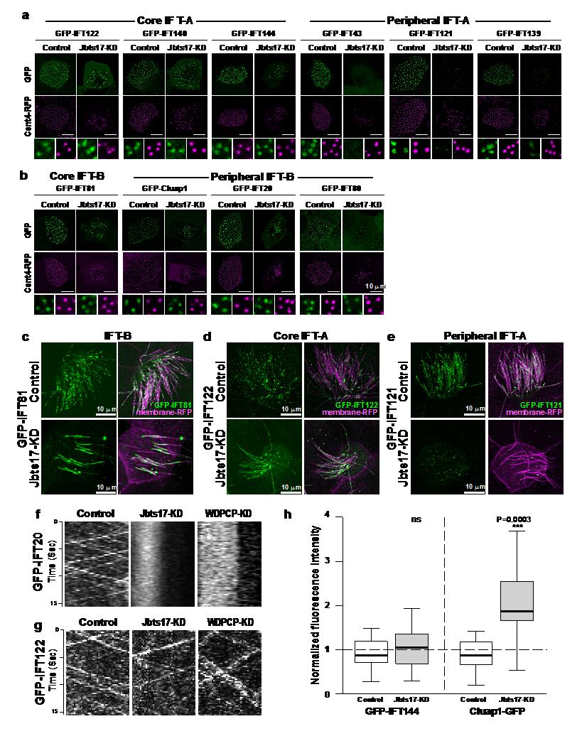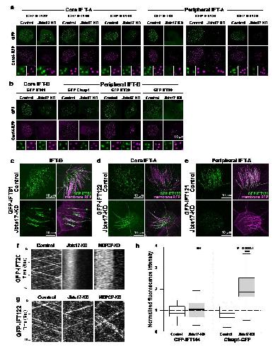 Supplementary Figure 5 CPLANE and IFT. (a,b) Fluorescence micrographs show the localization of indicated, GFP-tagged IFT-A (a) and IFT-B (b) proteins at basal bodies in multi-ciliated cells. Bottom panels in each figure show high-magnification images of basal bodies. (c-e) Live images of multi-ciliated cells expressing GFP-tagged IFTs (green) and membrane-RFP (magenta) in control and Jbts17 morphants. (f,g) Kymographs representing movements of IFT particles in control, Jbts17 and WDPCP morphant. (f) GFP-IFT20. (g) GFP-IFT122. (h) Plot showing mean intensity of IFT protein fusions in axonemes. Scale bars, 10 m. |