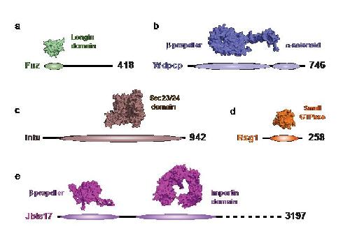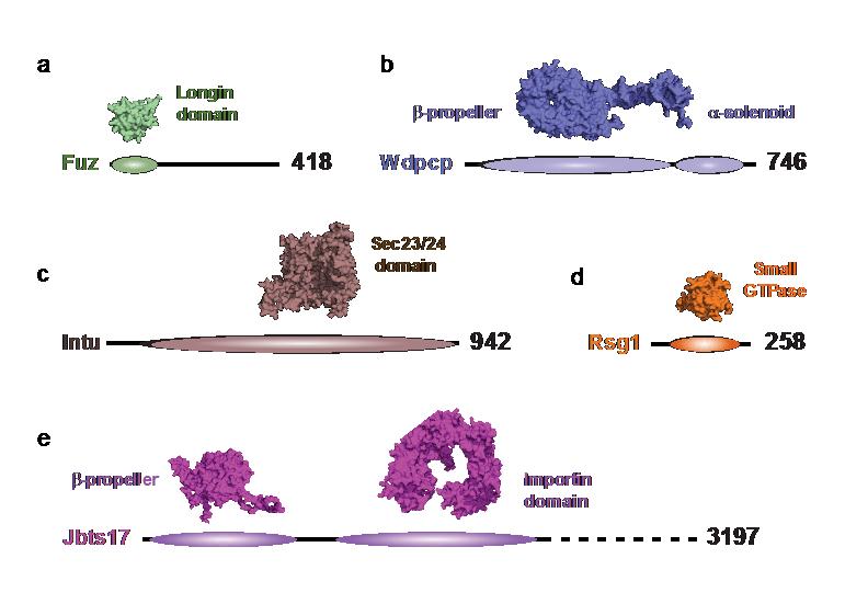 Supplementary Figure 7 Models of CPLANE protein structures. (a) Fuz. (b) Wdpcp. (c) Intu. (d) Rsg1. (e) Jbts17. As outlined in the Discussion, modeling predicts similarities between CPLANE proteins and vesicle trafficking machinery. |