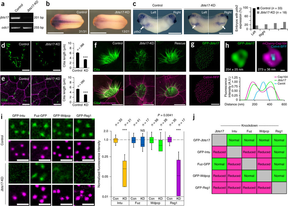 Figure 2. (a) RTâPCR demonstrates disrupted jbts17 splicing after MO injection (Jbts17-KD). odc1 is the loading control. (b) In situ hybridization of the Sonic Hedgehog (SHH) direct target nkx2.2 in control embryos and ones with Jbts17 knockdown (stage 22). Scale bars, 2 mm. Fractions represent the fraction of embryos displaying the phenotype. (c) Expression of pitx2, which labels the left lateral plate, at stage 26. Arrows indicate signal in left lateral plate mesoderm (LPM); the graph represents pitx2 expression patterns in embryos. Scale bars, 1 mm. (d) Immunostaining for acetylated α-tubulin, which labels cilia, shows ciliogenesis defects after Jbts17 knockdown in the ventral neural tube (stage 22). Scale bars, 10 μm. (e) Immunostaining for acetylated α-tubulin shows that Jbts17 knockdown reduces cilia length; cilia numbers are unchanged. Scale bars, 10 μm; membrane-RFP labels membranes. The graphs in d and e each show pooled data from two independent experiments for cilia length (shown as means ± s.e.m.; ***P < 0.001). (f) MCCs from control embryos, embryos with Jbts17 knockdown showing disrupted cilia, and Jbts17-knockdown embryos rescued with untargeted jbts17 mRNA labeled by GFP-Cfap20 (green); membrane-RFP labels membranes. Scale bars, 10 μm. (g) GFP-tagged Jbts17 localizes near basal bodies (visualized with coexpressed Cetn4-RFP) in an MCC. Scale bar, 10 μm. (h) Super-resolution image of GFP-Jbts17 and mCherry-Cep164 at a single basal body; both form rings of ~260 nm in diameter around the basal body, visualized by Cetn4-BFP. Diameters are shown as means ± s.d. in each panel. The graph shows fluorescence intensities (in arbitrary units) for GFP-Jbts17, mCherry-Cep164 and Cetn4-BFP. Scale bar, 100 nm. (i) GFP-tagged CPLANE proteins (green) and basal bodies visualized by Cetn4-RFP (magenta) in control and Jbts17-knockdown MCCs. Scale bars, 1 μm. In box plots of CPLANE fluorescence intensities at basal bodies, boxes extend from the 25th to the 75th percentile, with a line at the median; whiskers indicate maximum and minimum values. **P = 0.0041, ***P < 0.001; NS, not significant. Con, control. (j) Table summarizing the localization of CPLANE proteins at basal bodies for each knockdown (Supplementary Fig. 2câf). |