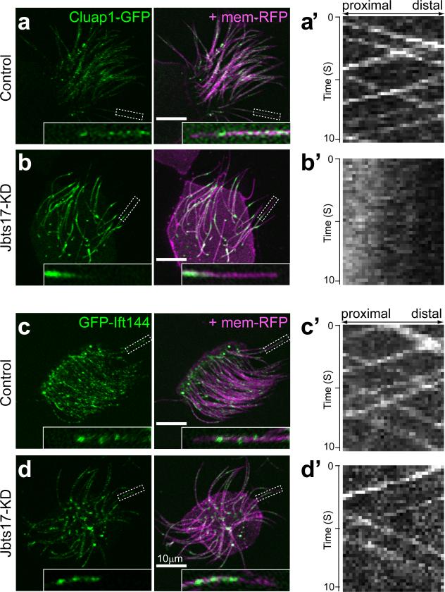 Figure 4. Jbts17 is required for bi-directional axonemal transport of IFT-B particles, but not the core IFT-AStill images from high-speed time-lapse movies of IFT using GFP fusion to IFT proteins (green) and membrane-RFP (magenta). Cluap1-GFP in control embryo (a) and Jbts17 morphant (b). GFP-IFT144 in control (c) and Jbts17 morphant (d). Insets show high magnification views of localization of IFT particles in a single axoneme in the boxed regions. Scale bars = 10 μm. Associated kymograph representing movements of IFT particles are shown in panels aâ-dâ. |