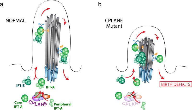 Figure 7. Models for CPLANE function and structure(a) Schematic of normal IFT. Peripheral proteins are assembled onto the IFT-A core in the cytoplasm and injected together with IFT-B for bi-direction transport in axonemes. (b) In the absence of CPLANE, IFT-A core particles lacking peripheral proteins are injected into axonemes and traffic normally; IFT-B enters axonemes but fails to move in a retrograde direction and accumulates. |