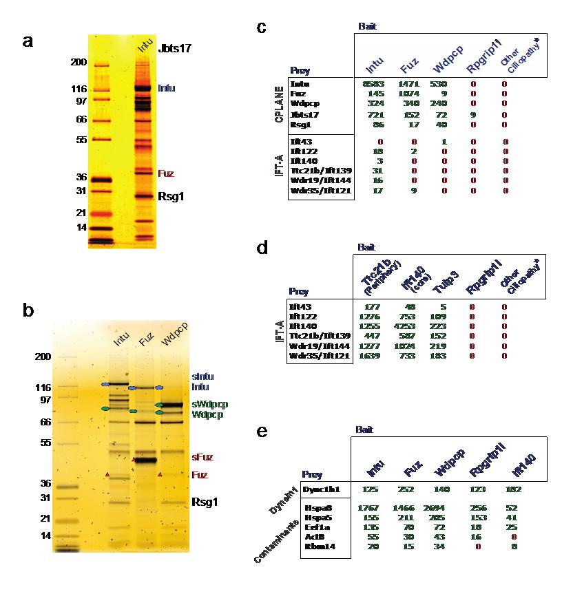 Supplementary Figure 1 CPLANE pulldowns. (a) Tandem affinity purification of Inturned interacting proteins. Lysates from murine IMCD3 collecting duct cells stably expressing LAP-Intu were subjected to tandem affinity purification and silver stain to visualize major interacting species. Molecular mass markers are indicated on the left. (b) Tandem affinity purification of interacting proteins for Inturned, Fuz and Wdpcp. “s” indicates the tagged proteins. Molecular mass markers are indicated on the left. The calculated molecular masses for these proteins are: mIntu, 104.8 kDa; mFuz, 45.5 kDa; mWdpcp, 81.7 kDa. (c-e) Tables showing an extracted subset of data from Supplementary Data Set 1 and highlighting key findings reported here. Numbers indicate peptide spectral matches for preys retrieved after pulldowns with indicated baits. The “Other Ciliopathy” column reflects combined data from pulldowns of Ahi1, Cep290, Invs, Iqcb1 and Nphp4. |