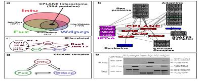 Supplementary Figure 2 CPLANE interactors. (a) Venn diagram showing overlap between the interactomes of Intu, Fuz, and Wdpcp. The intersection of the three (“combined CPLANE interactome”) contains ~250 proteins. (b) Additional components of the extended CPLANE protein network built using data from tandem affinity purification of Intu, Fuz, Wdpcp, IFT-A, and the published NPHP network and thresholded for most likely network members. (c) The CPLANE proteins associate with IFT-A proteins and poorly characterized cilia-related proteins (arrows indicates baitprey in Fuz, Wdpcp and Intu pulldowns). (d) The core CPLANE complex was identified by reciprocal pulldowns. (e) Co-IP with in vitro translated proteins confirms CPLANE interactions with Jbts17 (a fragment of Jbts17 was used, as the very large size of this protein made in vitro translation intractable). |