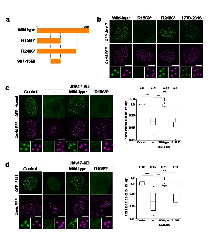 Supplementary Figure 4 Effect of a Joubert-associated CPLANE allele. (a) Jbts17 truncated mutants and fragments construct used in this study. (b) Fluorescence images in multi-ciliated cells expressing GFP-tagged Jbts17 wild-type, R1569*, R2406* and amino acids 1770-2318. (c,d) Fluorescence images GFP-tagged Inturned (c) and GFP-Ift43 (d) in multi-ciliated cells in control, Jbts17 knockdown, Jbst17-wild-type or truncated mutant (R1569*) expressing cells in Jbts17 knockdown embryos. The graph shows the normalized fluorescence intensity of GFP-Inturned (c) and GFP-IFT43 (d) at basal bodies, as described in legend to Supplementary Figure 2. Scale bars, 10 ïm. |