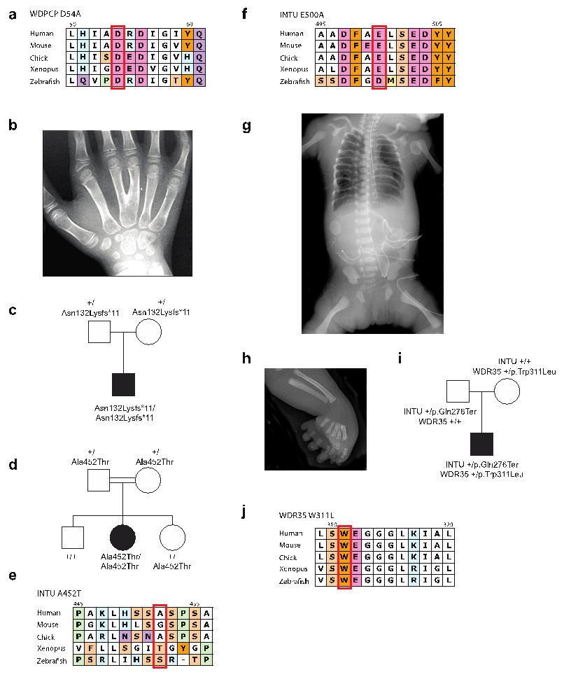 Supplementary Figure 6 CPLANE mutations in human patients. (a) The D54 residue of WDPCP that is mutated in OFD is invariant from human to fish. (b) Y-shaped metacarpals in a human OFD patient with a mutation in INTU; this is patient #2 from Panigrahi et al., 2013. (c) An INTU mutation segregates with the OFD phenotype. (d) An INTU missense mutation segregates with NPHP in another family. (e) The A452 residue of INTU that is mutated in NPHP is not well conserved and may be hypomorphic, consistent with the more restricted phenotype in this patient. (f) The E500 residue of INTU that is mutated in SRP is invariant from human to fish. (g,h) Radiographs showing the phenotype of an SRP patient transheterozygous for mutations in INTU and WDR35 (Ift121), as indicated by the pedigree in panel i. (j) The W311 residue of WDR35 that is mutated in SRP is invariant from human to fish. |