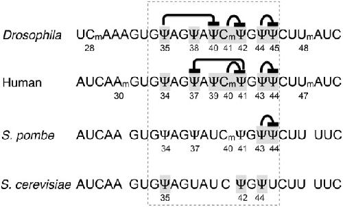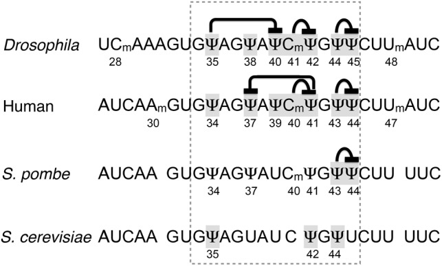 FIGURE 1. Post-transcriptional modification at the branch point recognition region of U2 snRNA from different species. The recognition region is highlighted with a dashed line. Positions examined in this and previous studies are shadowed. Proposed interactions between the tested positions are indicated. |