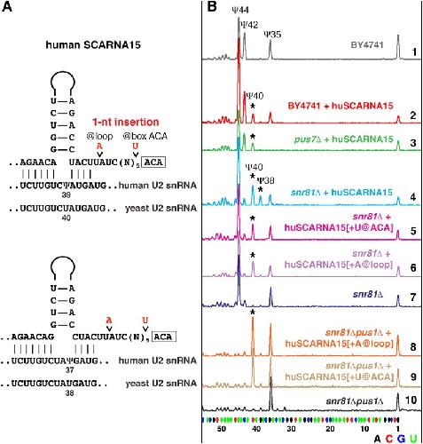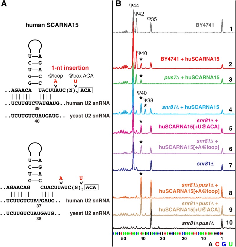 FIGURE 2. Pseudouridylation of yeast U2 snRNA induced by human SCARNA15. (A) Predicted base-pairing of huSCARNA15 with human and yeast U2 snRNA. Point mutations introduced into huSCARNA15 are shown in red. (B) Mapping of pseudouridines by fluorescent primer extension reactions. Top (gray) trace: Wild-type S. cerevisiae (BY4741) U2 snRNA is normally modified at positions 44, 42, and 35. Traces 2 (red) and 3 (green): When huSCARNA15 was expressed in the wild-type (red) or mutant pus7Δ strains (green), position 40 became pseudouridylated, as indicated by the star. Trace 4 (light blue): In the snr81Δ strain, huSCARNA15 induces pseudouridylation of positions 40 and 38 (stars). Traces 5 (magenta) and 6 (violet): 1-nt insertions between the box ACA and the upper stem (+U@ACA, or +A@loop) eliminate modification at position 38. Trace 7 (blue): Control snr81Δ strain without exogenous guide RNA. Traces 8–10: When expressed in the snr81Δpus1Δ mutant strain, the mutated RNAs produce only Ψ40 (star). |