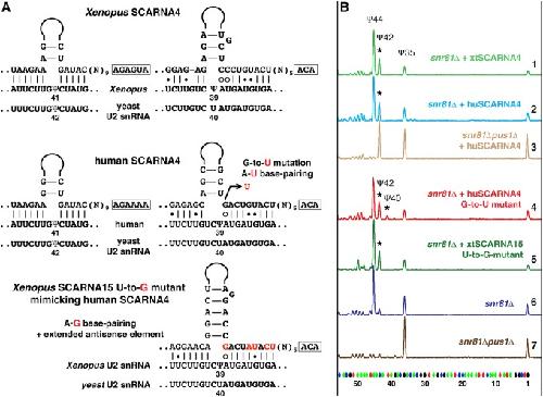 FIGURE 4. Pseudouridylation of yeast U2 snRNA induced by Xenopus and human SCARNA4. (A) Predicted base-pairing of SCARNA4 with vertebrate and yeast U2 snRNA. A point mutation in human SCARNA4 that converts the A–G mismatch into a canonical A–U base pair is shown in red. A mutated Xenopus SCARNA15 that mimics base-pairing of human SCARNA4 with U2 snRNA is also shown; mutated positions are highlighted in red. (B) Fluorescent primer extension reactions. Traces 1 (green), 2 (blue), and 3 (pale brown): Xenopus and human SCARNA4 rescue yeast U2 snRNA pseudouridylation at position 42 (star) in the snr81Δ and snr81Δpus1Δ mutant strains. Trace 4 (red): Human SCARNA4 shows no activity on position 40 unless G in the 3′-terminal pocket is mutated to U. Trace 5 (dark green): A–G base-pairing within the 3′ terminal pseudouridylation pocket of the mutated Xenopus SCARNA15 makes the 3′-terminal domain nonfunctional on yeast U2 snRNA. Note absence of Ψ40. Traces 6 (dark blue) and 7 (brown): Controls without exogenous RNAs. |