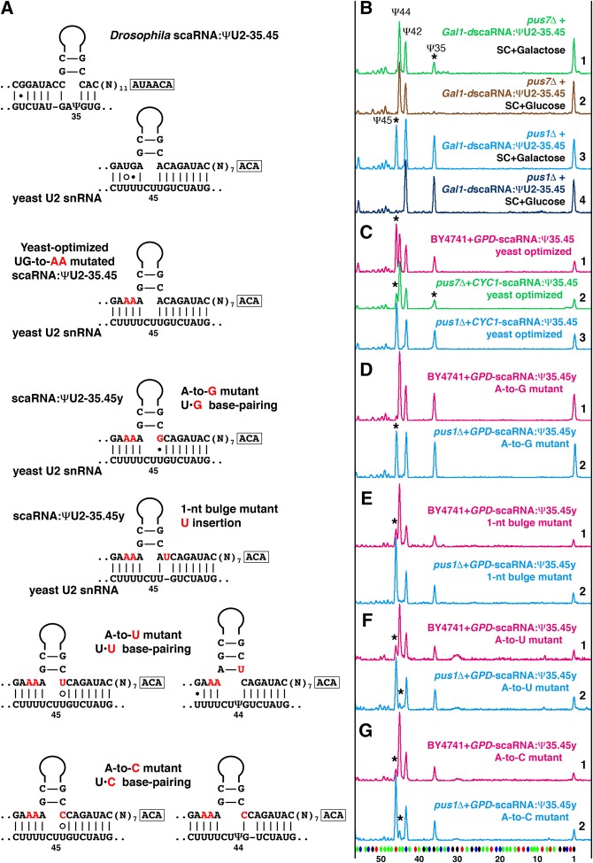FIGURE 5. Pseudouridylation of U2 snRNA at position 44 interferes with pseudouridylation at position 45 in the yeast cell system. (A) Base-pairing of wild-type and mutated variants of Drosophila scaRNA:ΨU2-35.45 with yeast U2 snRNA. Mutated nucleotides are shown in red. (B–G) Fluorescent primer extension reactions. (B) Traces 1 (green) and 2 (light brown): Drosophila scaRNA:ΨU2-35.45 cannot induce pseudouridylation at position 45 when expressed stepwise from an inducible Gal promoter in the pus7Δ yeast strain. Rescue of pseudouridylation at position 35 (star) serves as an internal positive control. Traces 3 (blue) and 4 (dark blue): In the same experimental setup, Drosophila scaRNA:ΨU2-35.45 is active at position 45 (star) in the pus1Δ strain, which has no Ψ44 in U2 snRNA. (C) Trace 1 (magenta): scaRNA:ΨU2-35.45 optimized for positioning Ψ45 in yeast U2 snRNA efficiently modifies position 45 in wild-type yeast strain only when overexpressed. Trace 2 (green): The same yeast-optimized RNA modifies position 45 inefficiently in Pus1p-positive strains, such as pus7Δ. Trace 3 (blue): This RNA is fully functional at position 45 in the pus1Δ strain. (D–G) Traces 1 (magenta): Point mutations in the 3′ side of the yeast-optimized U2-Ψ45 pseudouridylation pocket affect the corresponding modification activity, especially in the presence of U2-Ψ44 in a “wild-type” yeast strain. Traces 2 (blue): The U2-Ψ45 modification activity is evident in the absence of U2-Ψ44 in the pus1Δ yeast strain. Stars indicate guide RNA-induced pseudouridines. |