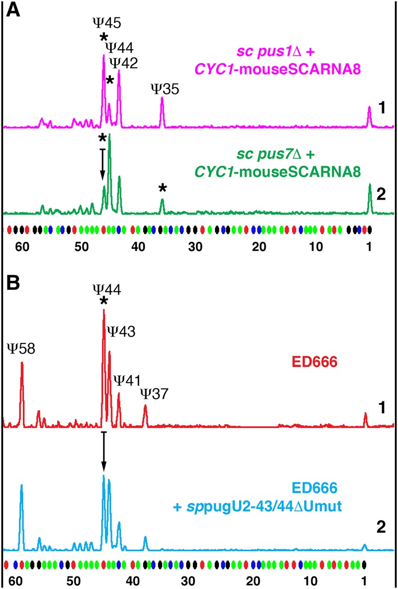 FIGURE 6. Prior pseudouridylation of U2 snRNA at position 43 inhibits positioning of Ψ44 by mouse SCARNA8 and S. pombe pugU2-43/44, SPNCRNA.1709. Fluorescent primer extension reactions. (A) Mouse SCARNA8 was expressed in the S. cerevisiae strains pus1Δ (top magenta trace) and pus7Δ (bottom green trace) from a plasmid with a weak CYC1 promoter that allowed prior modification of position 44 in yeast U2 snRNA by endogenous Pus1p. In the pus7Δ strain, modification of position 45 was reduced relative to that in the pus1Δ strain (arrow shows reduction in peak height). Stars indicate SCARNA8-induced pseudouridylation. Modification of position 35 in the pus7Δ strain served as an internal positive control. (B) Top trace (red): Pseudouridylation pattern of U2 snRNA in wild-type S. pombe (strain ED666). Bottom trace (blue): Overexpression of pugU2-43/44ΔUmut RNA caused reduction of pseudouridylation at position 44 (arrow shows reduction in peak height). |