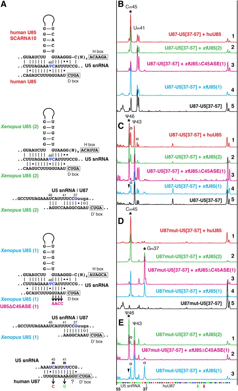 FIGURE 8. U85 scaRNA modification activity on U5 snRNA. (A) Predicted interactions of human U85, Xenopus U85, and human U87 scaRNAs with U5 snRNA. Targeted positions are shown in blue. Mutations introduced in antisense elements of Xenopus U85 and human U87 RNAs are color-coded to match colors used in B–E. (B–E) Fluorescent primer extension reactions. (B,D) 2′-O-methylation and (C,E) pseudouridylation of the 5′ loop of vertebrate U5 snRNA (nucleotides 37–57) inserted into U87 RNA and expressed in wild-type yeast cells. Stars indicate peaks that correspond to modifications induced by human U85 (traces 1, red in B–D) and two Xenopus wild-type U85 (traces 2, green and 4, blue in B–D; traces 1, 3 in E), and Xenopus U85 with mutated Cm45 antisense element, U85ΔC45ASE (traces 3, magenta in B–D; trace 2 in E). Arrowheads point to missing Ψ46. Trace 5, black in B, C, and D: Control samples of U87–U5 substrate RNAs expressed alone in yeast cells. In the tested artificial U5 snRNA substrate, U87–U5[37–57], position 43 is pseudouridylated by an unknown endogenous yeast snoRNA (C,E) and positions 41 and 45 are 2′-O-methylated by U87 RNA itself (B). (D) When the antisense element for positioning Um41 and Cm45 was removed from U87, U87mut-U5[37–57], an additional position became 2′-O-methylated by Xenopus U85; human U85 could not induce this modification. Open circles in C and E indicate stops at 2′-O-methylated positions. In the interest of space, only three Xenopus U85 traces are shown in E; the pattern induced by human U85 (not shown) is very similar to that in trace 1 (green) of Xenopus U85(2); the control U87mut-U5[37–57] alone (not shown) looks as expected, with one peak at Ψ43 and no extra peak at Um41. The sequence of U87–U5 substrate RNA and mutated positions are shown at the bottom of E. |