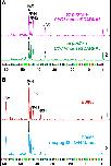 FIGURE 7. Prior 2′-O-methylation of a position in the branch point recognition region inhibits pseudouridylation of the following position. Fluorescent primer extension reactions. (A) Trace 3 (black): Expression of Drosophila scaRNA:MeU2-C41 in the wild-type S. cerevisiae strain BY4741 results in 2′-O-methylation of yeast U2 snRNA at position 41. Traces 1 (red) and 2 (blue): Methylation at position 41 results in dramatic reduction of pseudouridylation at position 42 (trace 2) relative to control (trace 1). (B) Traces 1 (red) and 2 (blue): In HeLa cells, overexpression of the methylation guide RNA for position C40 of U2 snRNA (trace 2) leads to a lower level of U2 snRNA pseudouridylation at position 41 than in control cells transfected with an empty vector (trace 1). The arrow in trace 2 shows reduction in peak height. |